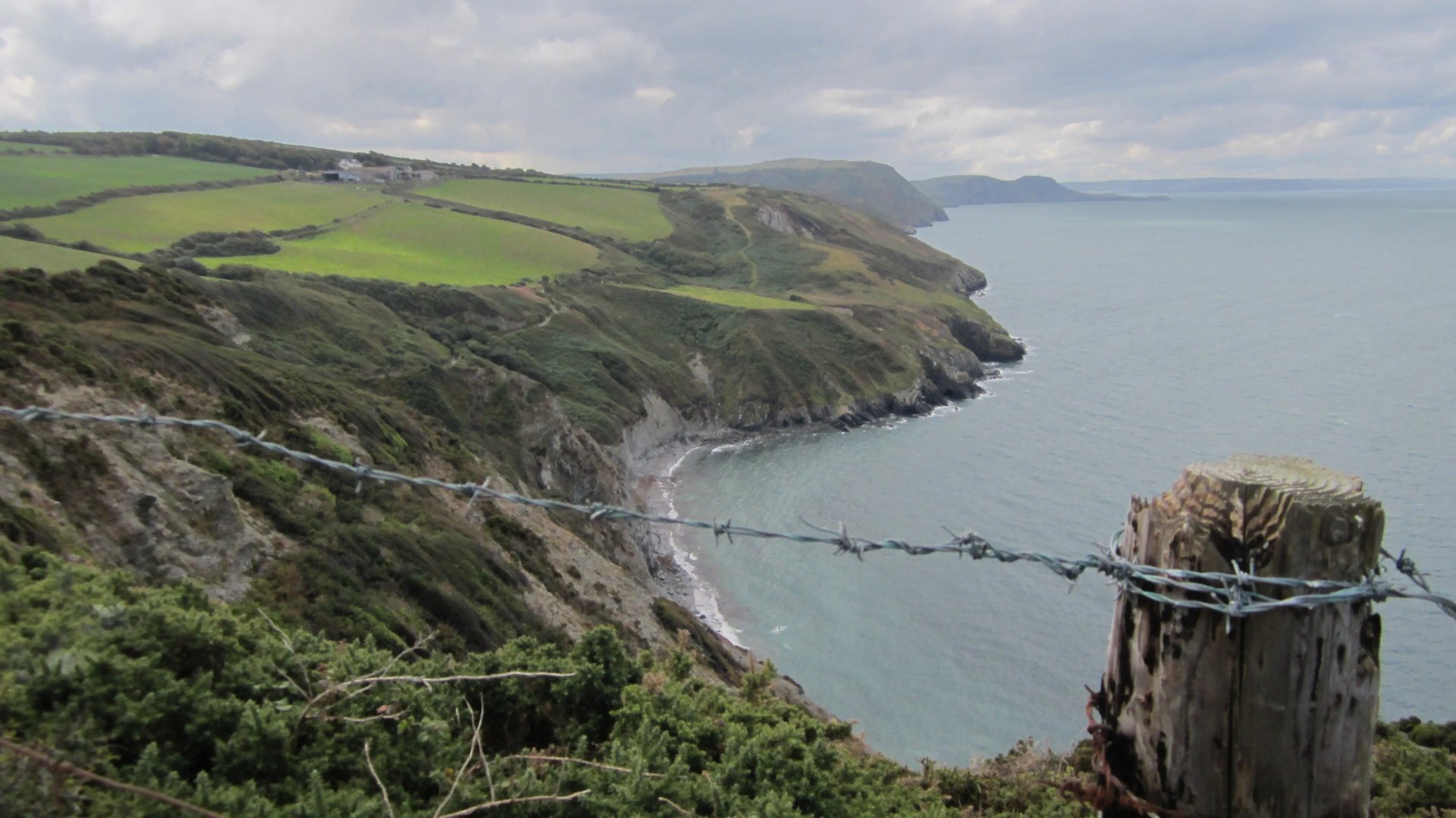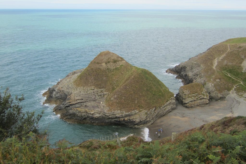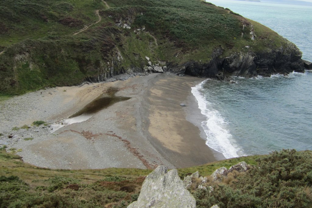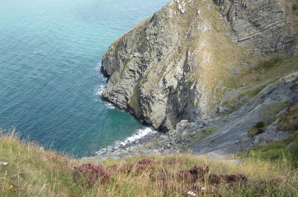 Auf und ab am Meer entlang, am Rand von steilen Kliffs, an die das Meer brandet, zwischen Heidegestrüpp und immer wieder Massen von Brombeersträuchern (eine immer wieder willkommene Erfrischung) hindurch schnaufe, klettere und stolpere ich die sieben Kilometer Küstenpfad begleitet von starkem Wind bis nach Cwmtydu hinab.