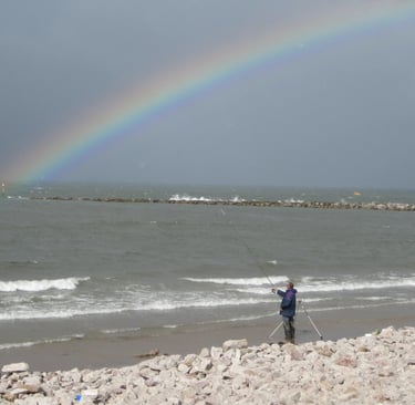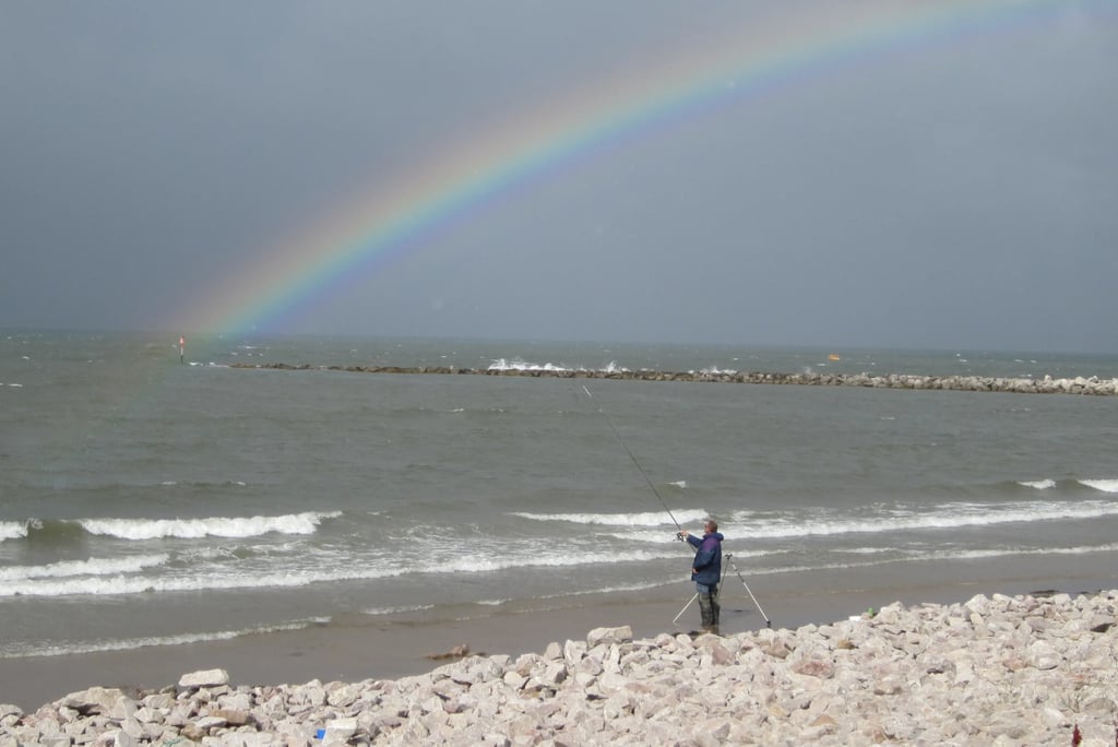 Auf halbem Weg entdecke ich einen Angler, der sich wohl wie Ronnie James Dio fühlen muss bei seinem Versuch, einen Regenbogen einzufangen.