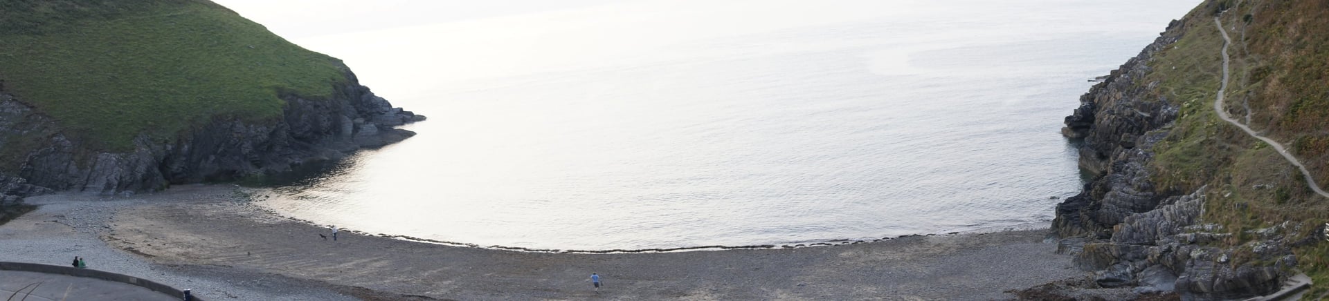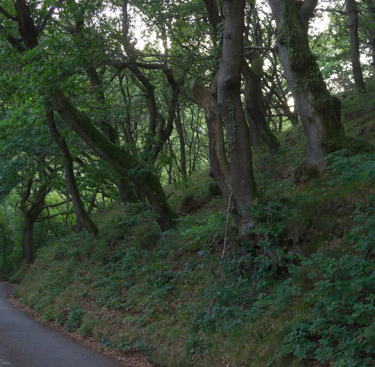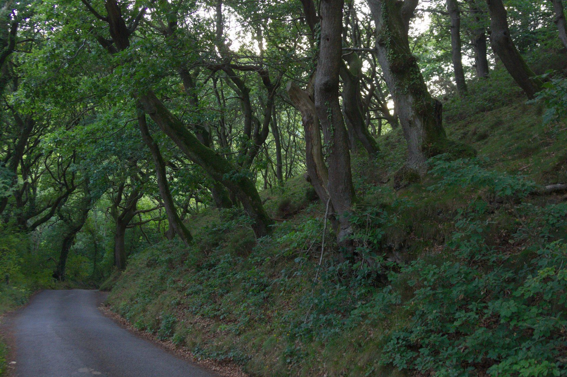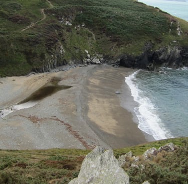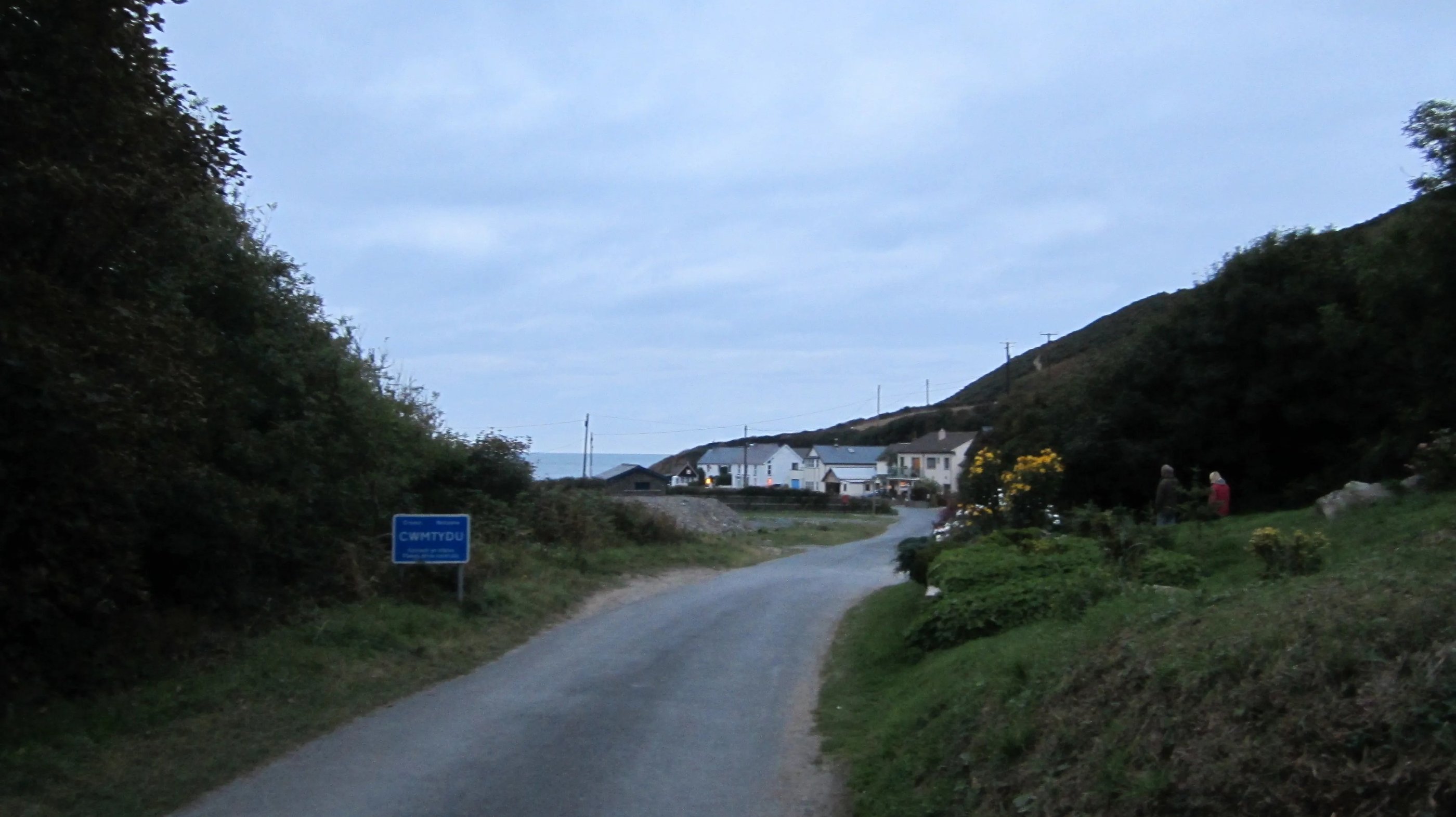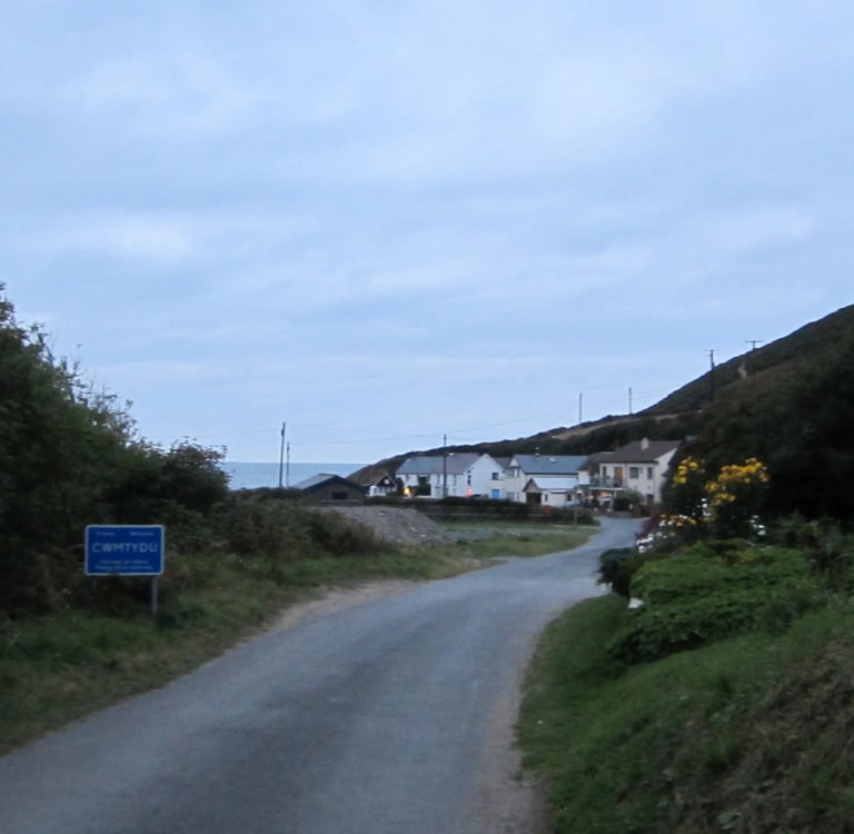 Drei Stunden später, nach breiten Flusstälern und dicht bewaldeten Gebieten, vorbei an Heidelandschaften und kargen Hügeln sowie den üblichen Schaf- und Rindertupfern schlängle ich mich - erstaunlicherweise nach wie vor vom Navigationsgerät geleitet, das zwar keine Ortsnamen, aber wenigstens die Postleitzahl zuordnen konnte - durch ein urtümlich bewaldetes Tal abwärts, wo mich am Ende die ehemalige Schmugglerbucht von Cwmtydu empfängt (die Aussprache des Ortsnamens ist Walisisch für Fortgeschrittene).