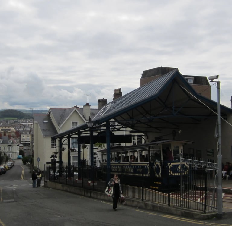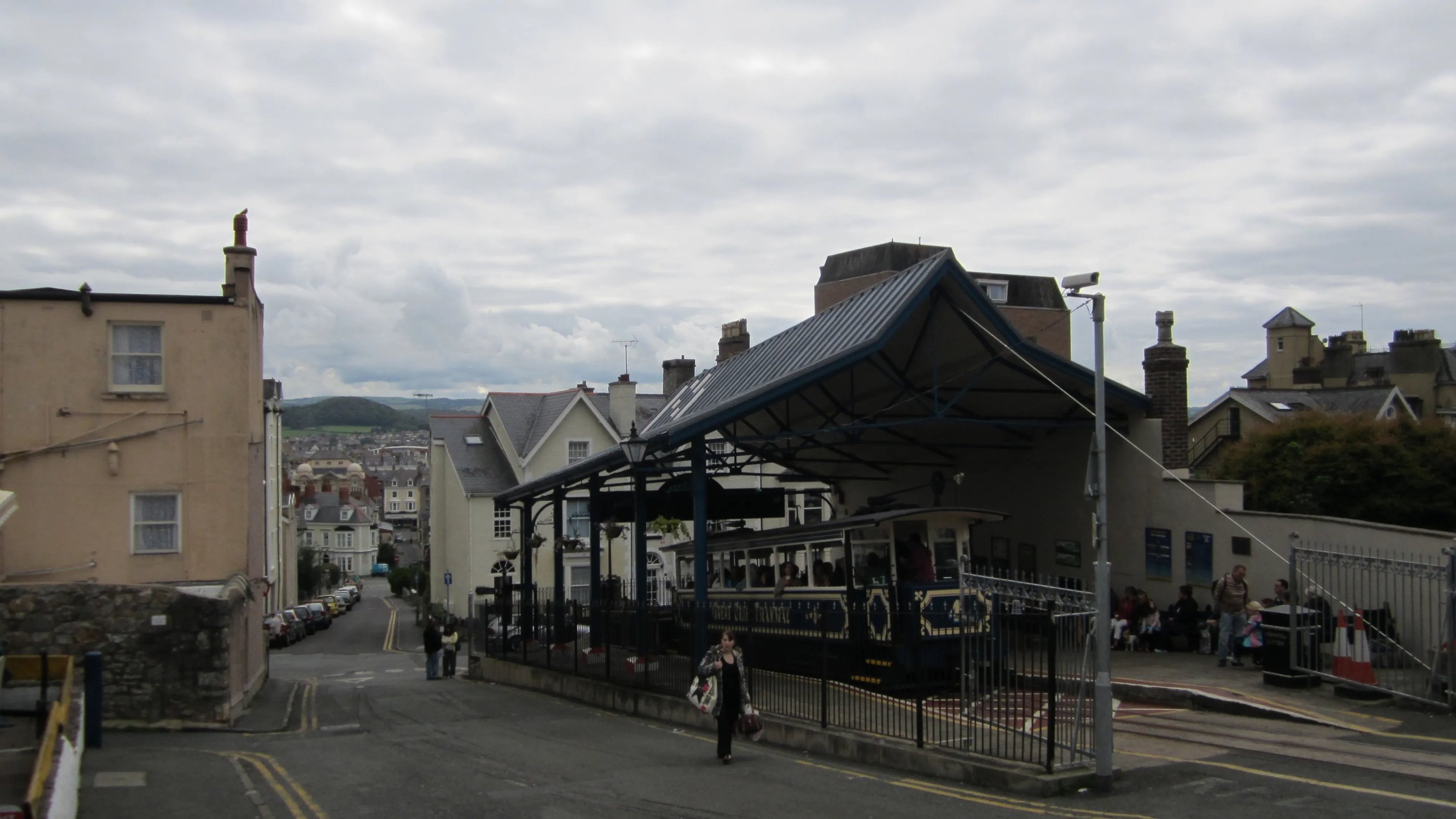 Dort bin ich im Nu von fußlahmen Senioren und Familien mit Kind (oder Hund oder beidem) umringt. Die erste Tram ist sofort voll, die zweite auch - aber ich will einen passablen Platz zum Filmen und habe es ja nicht eilig. Nach einem Kaffee geht es aufwärts. Der hölzerne Aufbau des Wagens knarrt und knarzt angesichts der Steigung, wir schleichen bergan zur Zwischenhaltestelle, wo umgestiegen wird - alles durch das Gewicht-Gegengewicht-Prinzip gesteuert. Und gebaut von einer Firma aus Zug (treffenderweise!) in der Schweiz. Oben befindet sich eine weitere Station mit viel Touristenkram. Ich tänzele zwischen Schafsexkrementen auf ansonsten unbetretenen Pfaden entlang und werde mit einigen schönen Ausblicken belohnt.