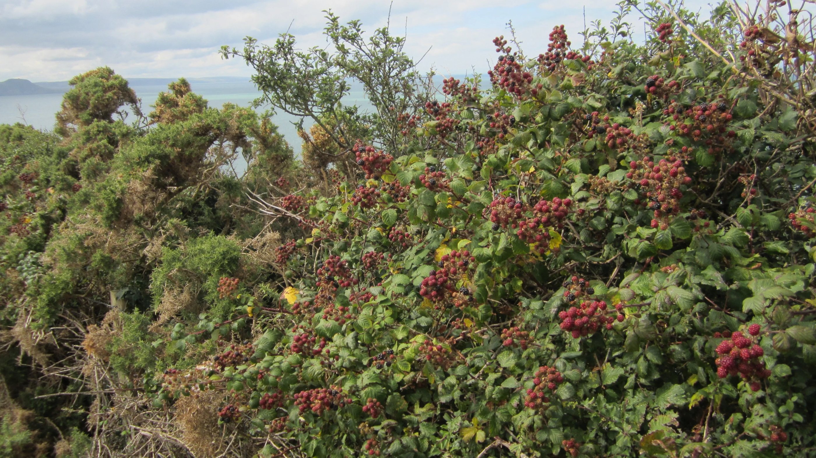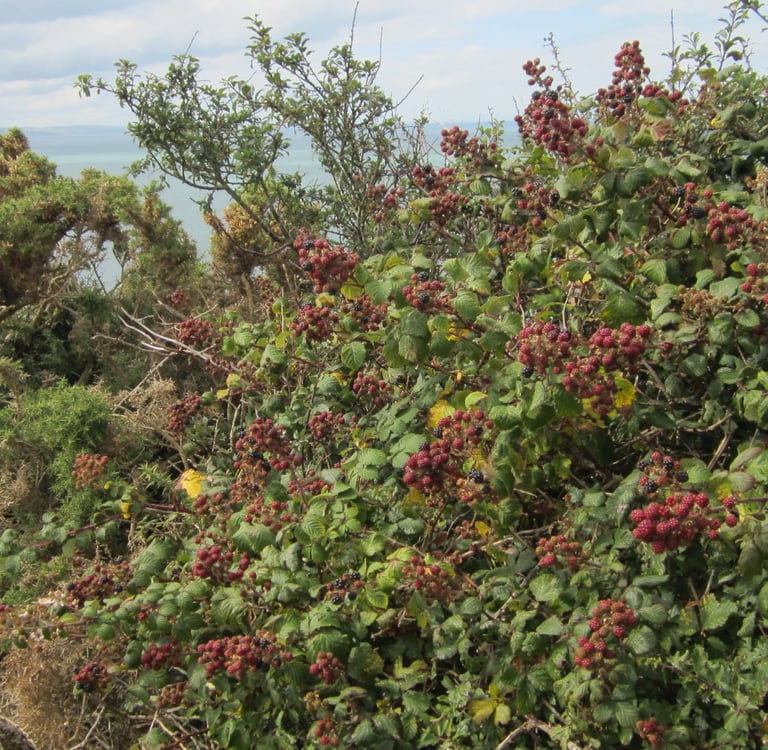 Schon bald wandere ich auf den Dünen, zwischen Unmengen von leider noch kaum wirklich reifen Früchte tragenden Brombeersträuchern hindurch - oft geschützt vom teils recht strengen Wind, entlang eines Golfplatzes.