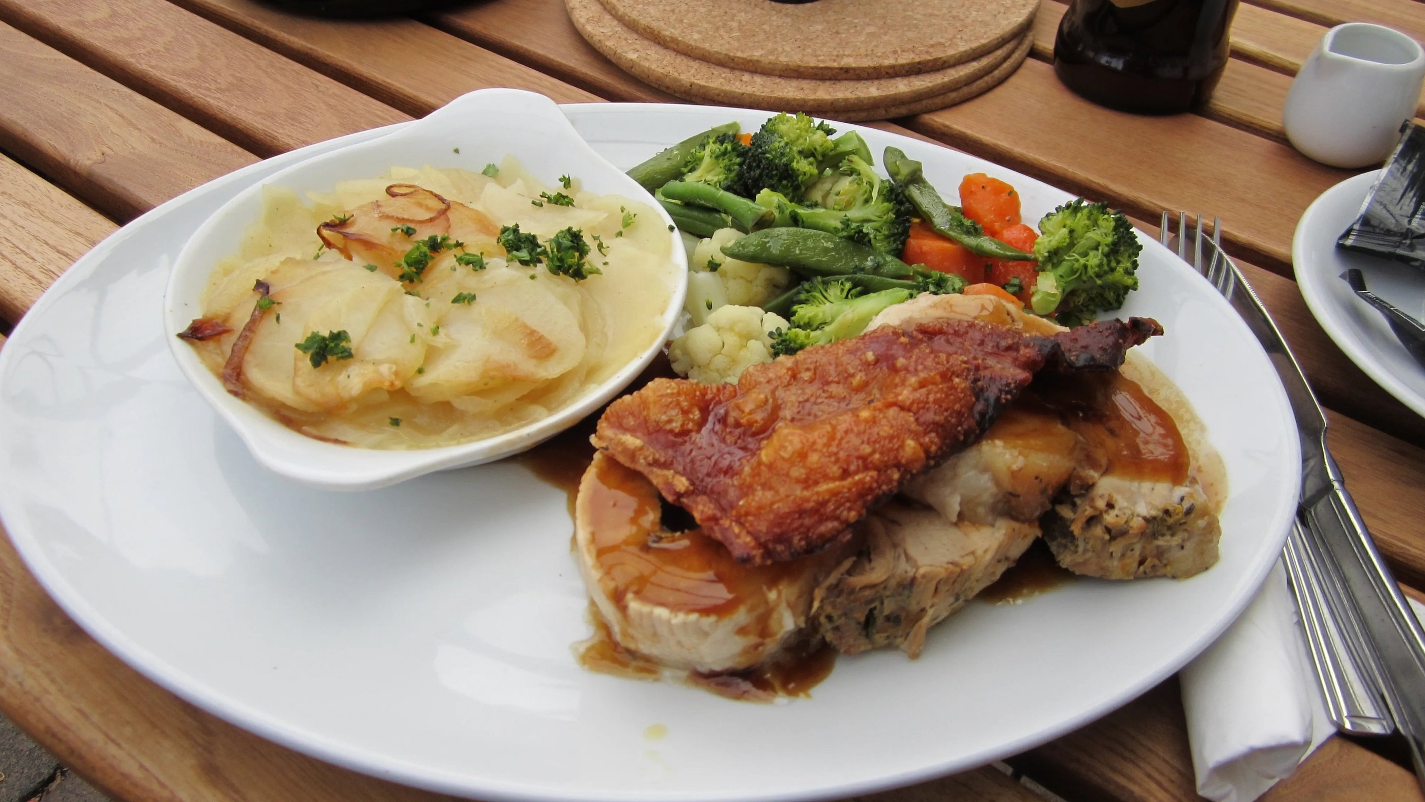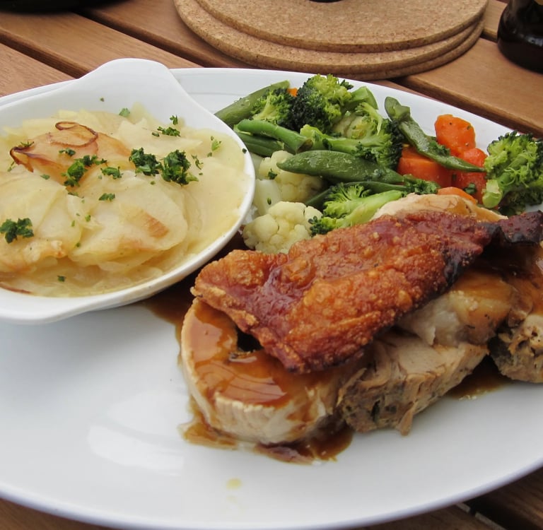 Das Ganze erinnert mich an einen Rollbraten, denn es ist mit Kräutern und auch Zitronenabrieb gefüllt und stellt sich als der beste Rollbraten heraus, den ich je gegessen habe. Das Stück Kruste obendrauf rundet die Sache ab. - So habe ich britische Küche nicht in Erinnerung!