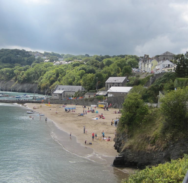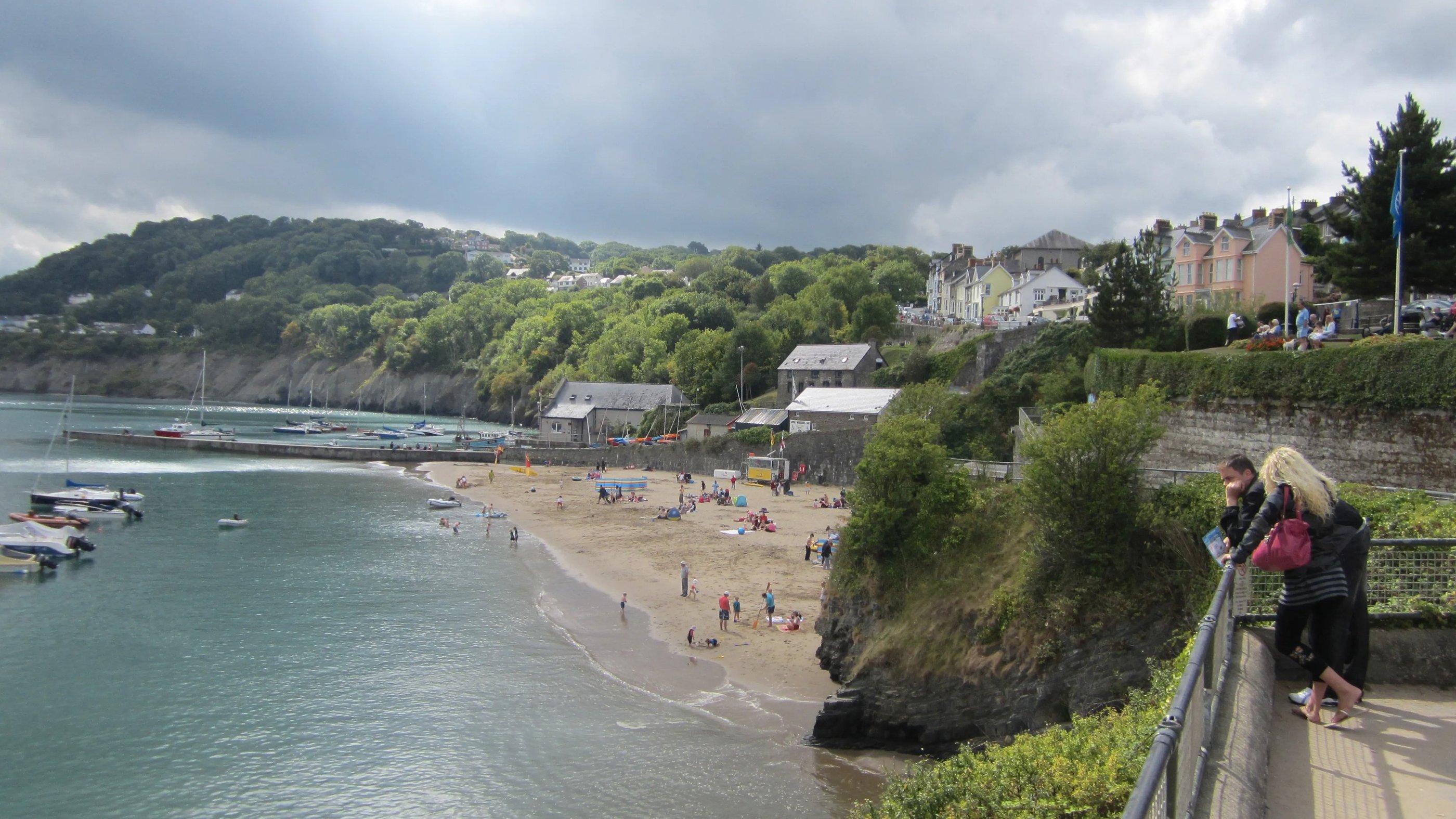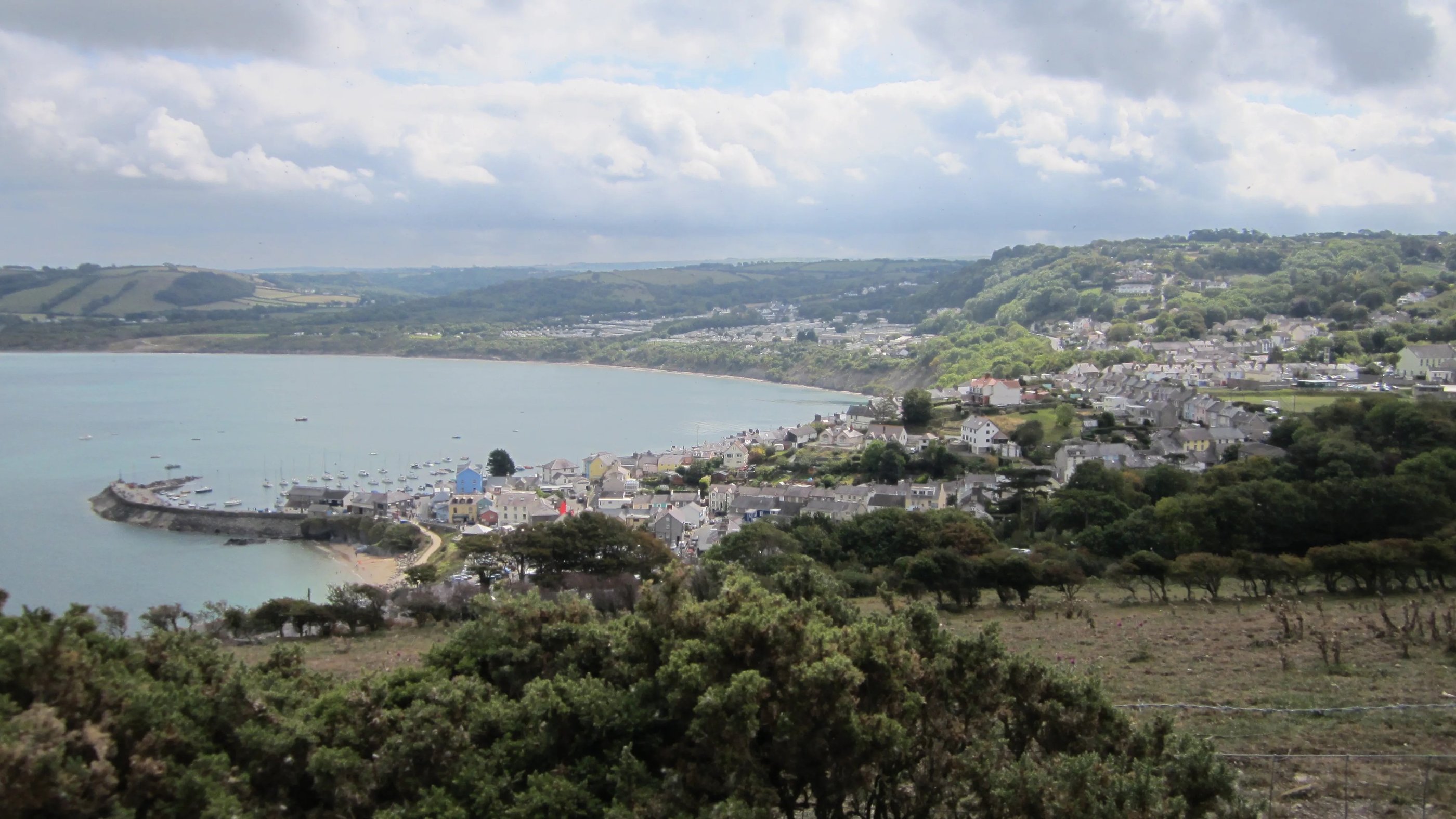 Nach dem Frühstück (geräucherter Hering mit gemüsigen Beilagen dieses Mal), bei dem ich erfahre, dass meine beiden Gastgeber gelernte Koche sind und sowohl schon erfolgreich eine Hospitalküche Birmingham als auch ein Pub weiter westlich geleitet hatten, bevor es sie an diesen entlegenen Winkel an der Waliser Westküste verschlug, begebe ich mich an den Strand, um auf den kleinen Regionalbus zu warten, der zweimal pro Tag in die eine oder andere Richtung fährt. Holprig und überaus abenteuerlich geht es um Ecken und Kurven die schmalen Sträßchen entlang, Steigungen hinauf und wilde Gefälle hinab, bis ins Fischerstädtchen New Quay.
