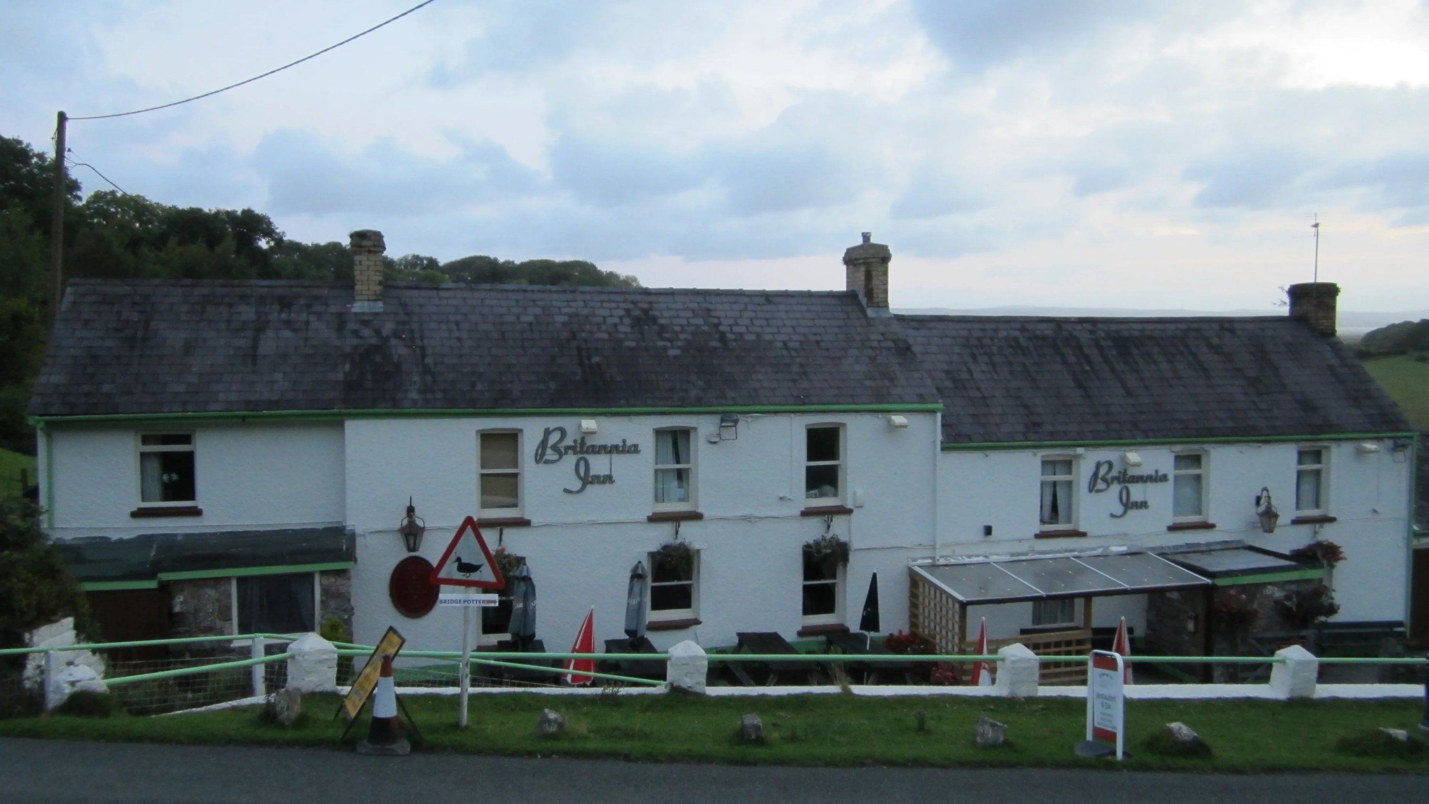 Es regnet in der Nacht. Und auch der Morgen ist ungemütlich nieselig und windig. Nach dem Frühstück geht es wieder weiter auf meinem Weg gen Süden - ich verabschiede mich und fahre zwei Stunden durch den Regen in Richtung Gower, einer Halbinsel vor Swansea, der letzten Station meiner Reise. Ich komme gegen 12 Uhr an, auch hier nieselt es wieder, und angesichts des für die nächsten Tage erneut überaus dürftigen Wetterberichts erwäge ich sogar eine Umbuchung meines Flugs auf den morgigen Tag, aber auf Nachfrage sind keine Plätze in meiner Klasse mehr frei - und ein Upgrade würde mich mehr kosten als der restliche Aufenthalt hier. Also bleibe ich und esse im örtlichen Pub/Restaurant “Britannia Inn” zu Mittag, vor dessen Eingang ein Schild vor wilden Erpeln zu warnen scheint. Oder eher vor Wildgänsen.