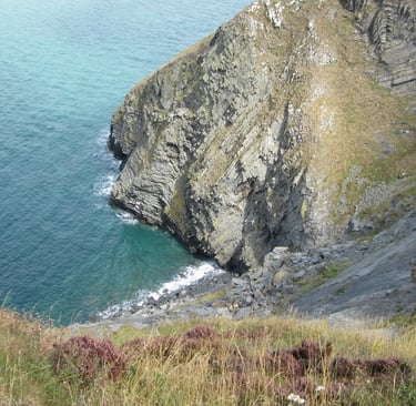 Rechts und links der Bucht schlängeln sich die “Coastal Paths” in beide Richtungen nach oben. Das steht für morgen auf dem Plan - falls das Wetter mitspielt. Hier ist es schön, die Sonne scheint, überall wachsen wieder Brombeeren (und viele sind nun reif). Ich mache es mir auf einem Felsen knapp oberhalb der Brandung bequem. So ist Urlaub!